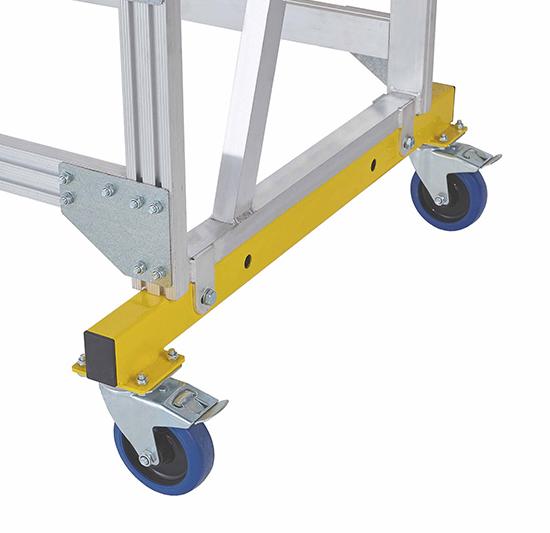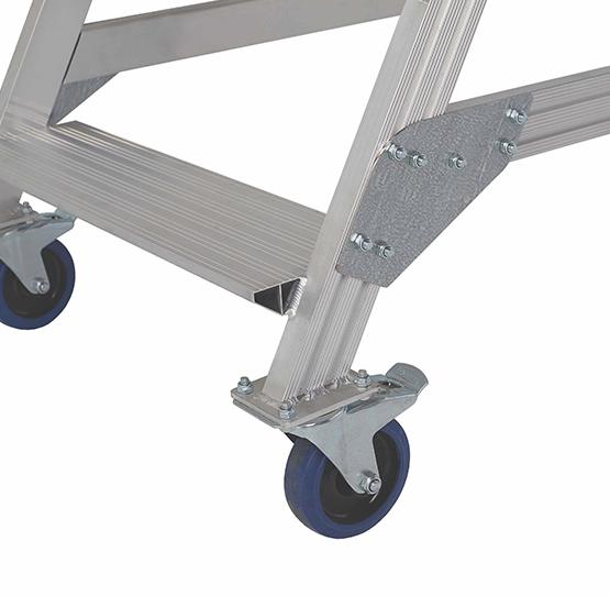 Вышка - стремянка разборная на колесах (300кг+150кг) MEGAL ВС3-2.0 предназначена для работ в торговых залах, на складах, вдоль стеллажей и других объектов, при проведении ремонтных, монтажных и иных работ на высоте. Представляет собой безопасную и легкую конструкцию из алюминиевых профилей высокой прочности. Имеет безопасные противоскользящие ступени из специального рифленого профиля. Площадка размером 800х680мм позволяет удобно расположиться рабочему с необходимым инструментом. Трехстороннее ограждение площадки со встроенной защитной планкой в районе колен, бортовое ограждение, перила по всей длине лестничного марша, ступени глубиной 160мм обеспечивают безопасный подъем, спуск и проведение работ, что подтверждает полное соответствие требованиям по ГОСТ. Все соединительные узлы и элементы полностью безопасны, обработаны и одобрены службой контроля качества. Простая и быстрая сборка лестницы без специального инструмента и поставка в виде предварительно собранных узлов сокращают время подготовки оборудования MEGAL к работе. Максимальный срок службы достигнут благодаря коррозионностойким свойствам алюминиевых сплавов. Небольшая занимаемая площадь и прочные поворотные колеса со стопорами позволяют легко маневрировать в ограниченном пространстве.