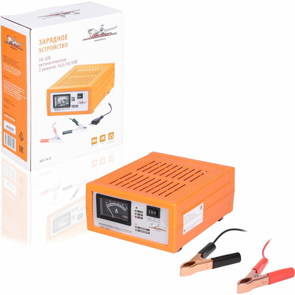 Зарядное устройство Airline 7 А, 12 В, амперметр, автомат, импульсный ACH-7A-13 для свинцово-кислотных аккумуляторов с номинальным напряжением 12 В обеспечивает заряд постоянным током до напряжения 14.5/15/16 В. Позволяет заряжать аккумуляторные батареи ёмкостью от 1.2 до 100 Ач. Зарядка происходит в автоматическом режиме. После окончания зарядки устройство может поддерживать заряд АКБ длительное время.