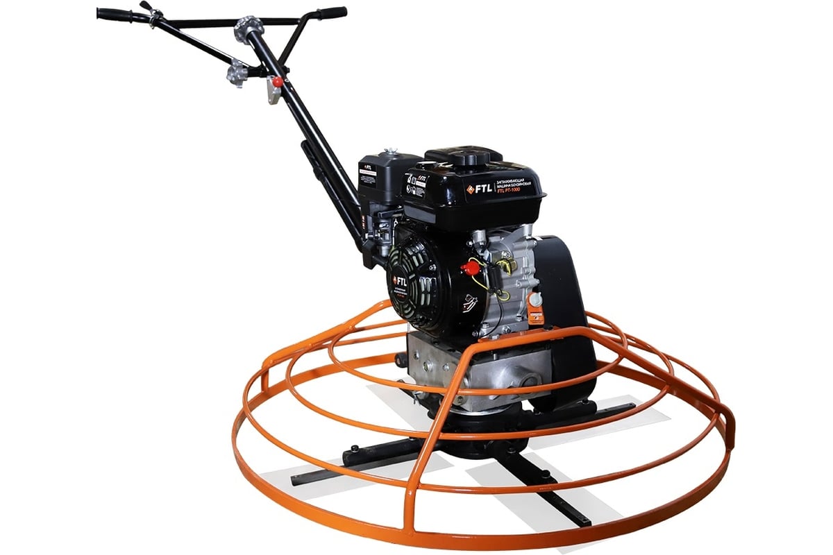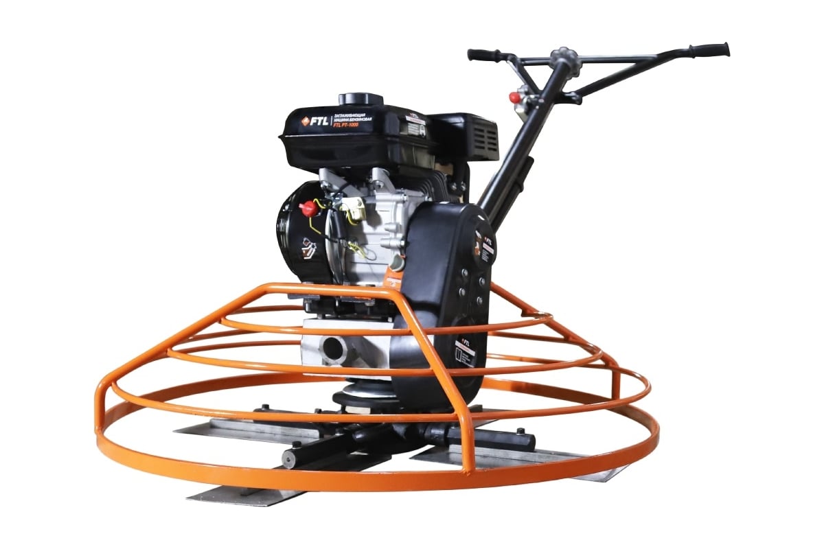 Затирочная бензиновая машина PT-1000 FTL 7989 - профессиональный инструмент, предназначенный для выравнивания стяжки, заглаживания, затирки и окончательной отделки бетонных поверхностей на завершающих стадиях устройства бетонных полов в строительстве. Выходной вал бензинового двигателя через ременную передачу вращает ось затирочного диска. Оператор регулирует обороты машины и направляет с помощью ручки (водила) в нужную сторону.