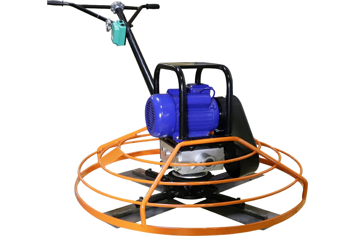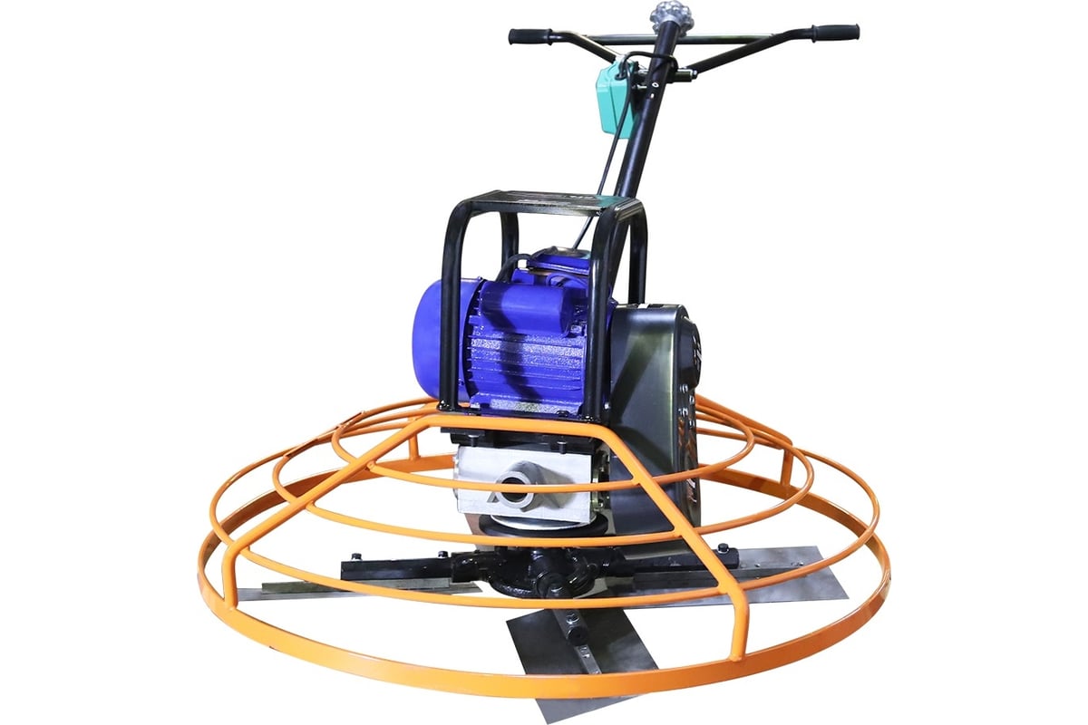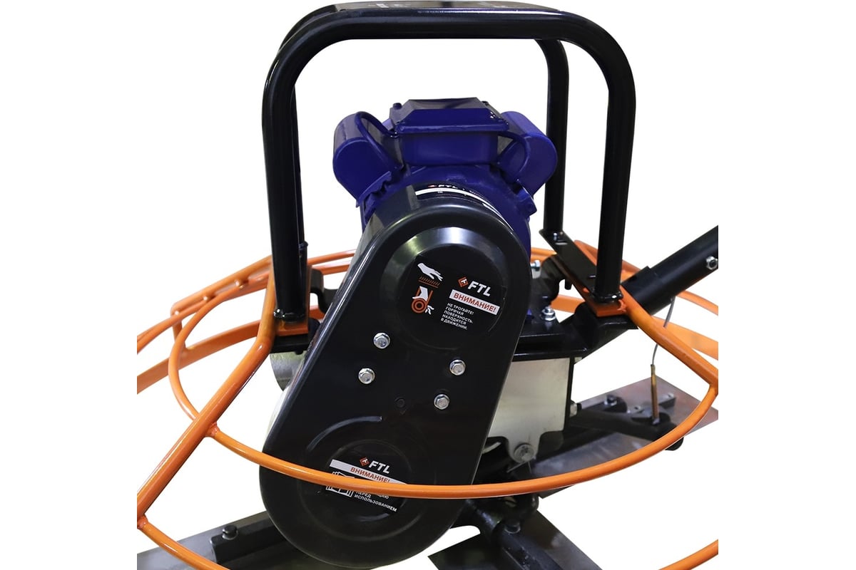 Затирочная электрическая машина FTL PT-1000E 7992 служит для чистовой обработки бетонных поверхностей, управляемую идущим сзади оператором. Затирочная машина состоит из рамы, на которой установлены электродвигатель, редуктор и рукоятка управления. К редуктору присоединен комплект из четырех металлических лопастей, окруженных кольцевым ограждением. Двигатель передает вращение на лопасти через редуктор и механизм сцепления. Вращающиеся лопасти перемещаются по поверхности затвердевающего бетона, создавая гладкую поверхность. Оператор идет позади агрегата и с помощью рукоятки управляет направлением движения. Данный агрегат предназначен для затирки и полировки затвердевающих бетонных поверхностей.