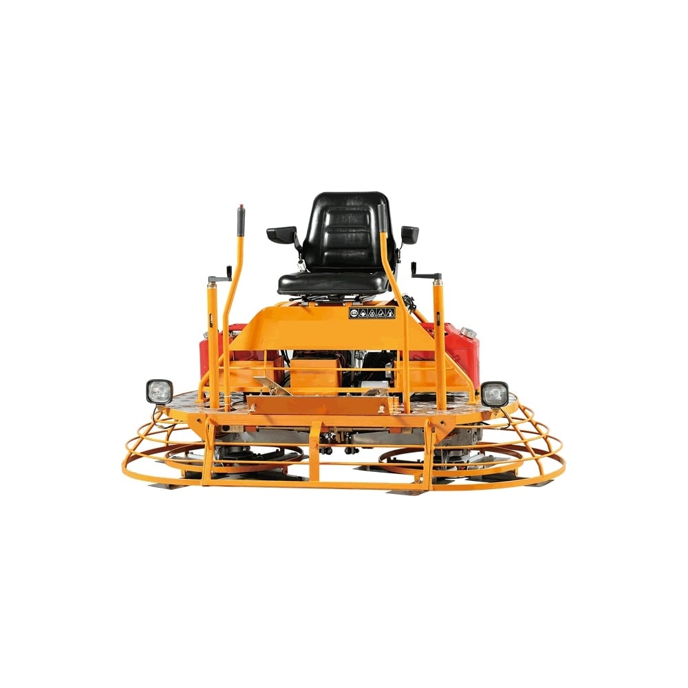 KOMAN MRT73 - профессиональная двухроторная затирочная машина для обработки бетонных поверхностей. Строительный вертолет применяют для создания качественных чистовых полов или стоянок залитых бетонным составом. Два модуля позволяют работать с режиме шлифования дисками или лопастями. Диаметр дисков 900 мм. Технология шлифования цементной поверхности на стадии набора прочности, когда бетон эффективно поддается заглаживающему воздействию. Обработку начинают, когда состав не проминается под массой машины. Модель укомплектована мотором Honda GX690 объемом 688 см3, мощностью 24 л.с. Это эффективный двухцилиндровый бензиновый двигатель с максимальным крутящим моментом 48.3 Нм при 2500 об/мин. Частота вращения роторов находится в диапазоне 130-150 об/мин. Это профессиональный показатель, обеспечивающий хороший результат чистового шлифования покрытий. При необходимости доступна функция регулировки угла наклона лезвий. Это актуально для адаптации техники под различные производственные ситуации - работа с бетонными заливками на различной стадии затвердевания. Управление машиной производит оператор, располагаясь на специальном сидении. Две рукояти служат для создания управляющих комбинаций, которые двигают машину в нужном направлении. Запуск осуществляется через электрический стартер, расположенный по левую сторону от сидения. Предусмотрены фонари для подсветки поверхности, с целью выявления неровностей и проработки локальных областей. Вертолет дает возможность создать ровные качественные полы на больших площадях за определенное время. Высокая производительность важное достоинство представленной модификации. Запас мощности ДВС способствует повышению продуктивности работы агрегата.