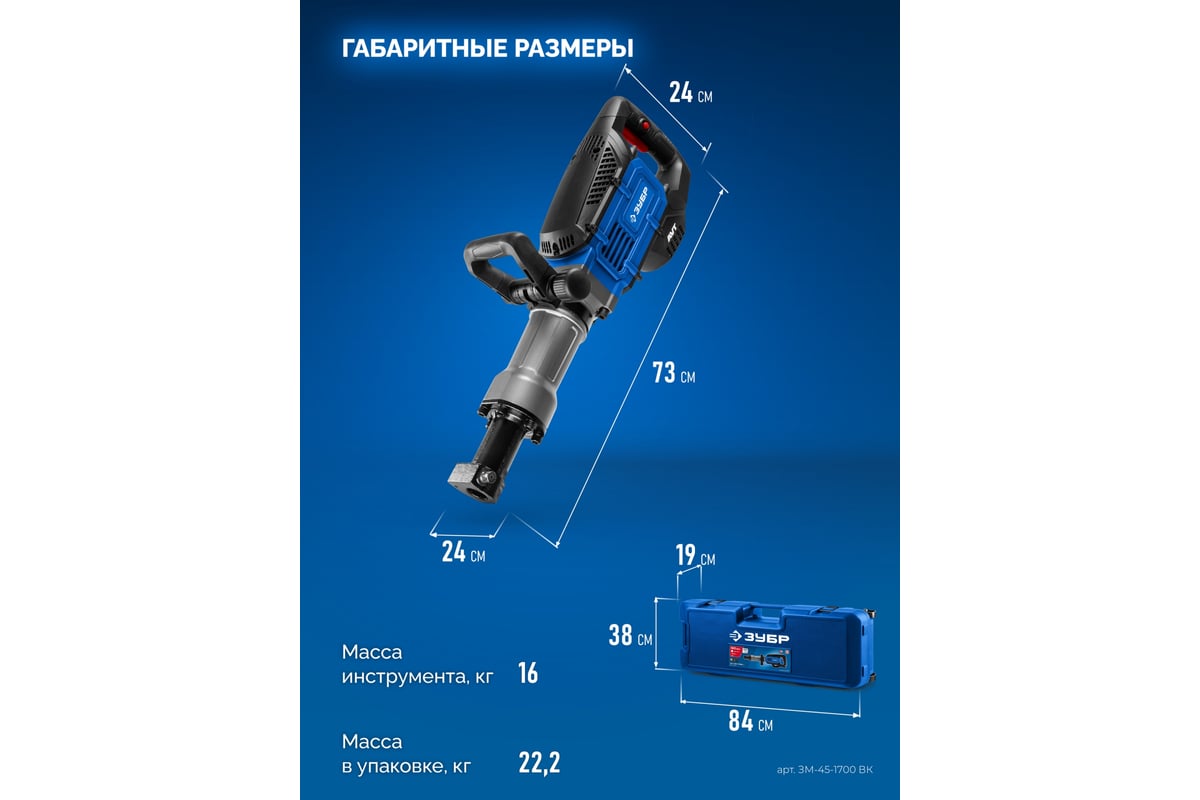 Мощный инструмент для ударного разрушения различных конструкций из бетона, железобетона, кирпича и камня, дробления асфальтовых, бетонных и плиточных покрытий, разрыхления твердого, скального, промерзшего грунта, а также для уплотнения и трамбовки грунта, раскалывания льда, дров, забивания цилиндрических стержней и других строительных работ.