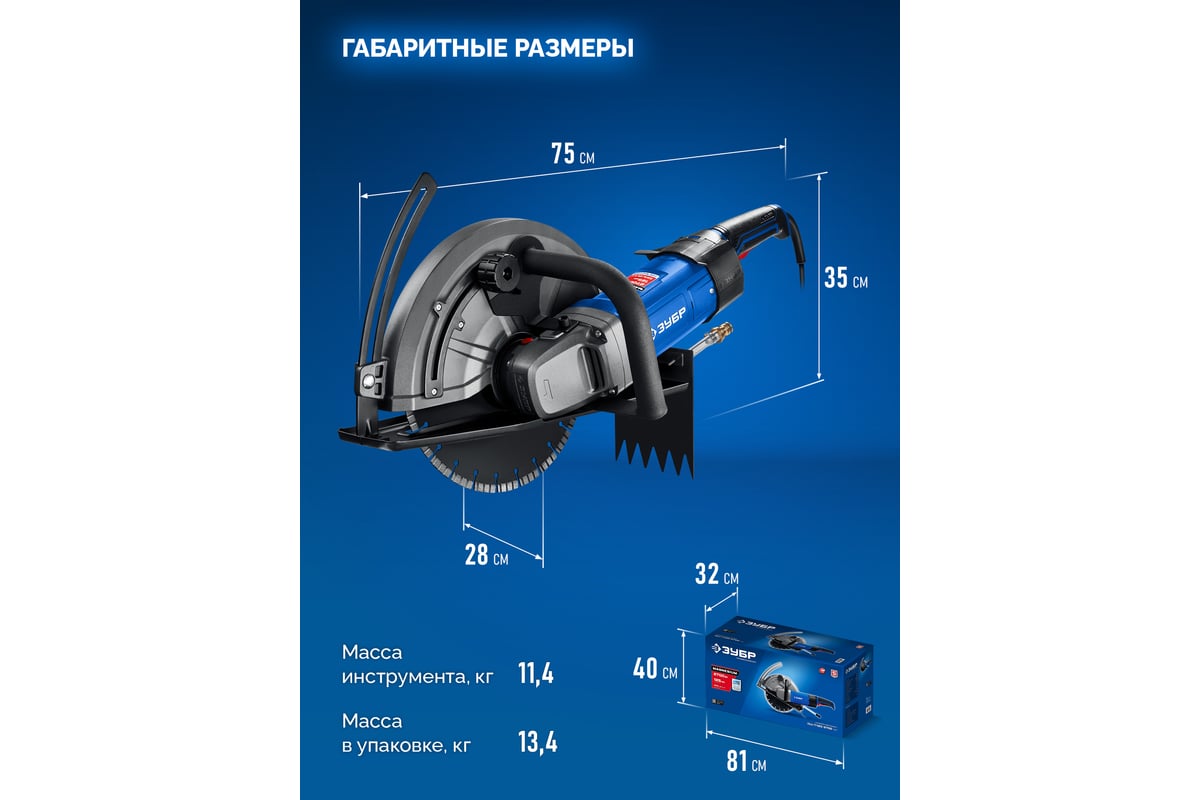 Инструмент для наиболее трудных и глубоких (до 125 мм) резов любых материалов - бетона, асфальта, бордюров, металла, кирпича. Высокая мощность двигателя в сочетании с передаточным отношением редуктора дает большой крутящий момент на валу, что позволяет резать быстро и эффективно. Эффективный пылеотвод или работа с подачей воды защищают от пыли. Съемное основание для горизонтальных продольных резов.